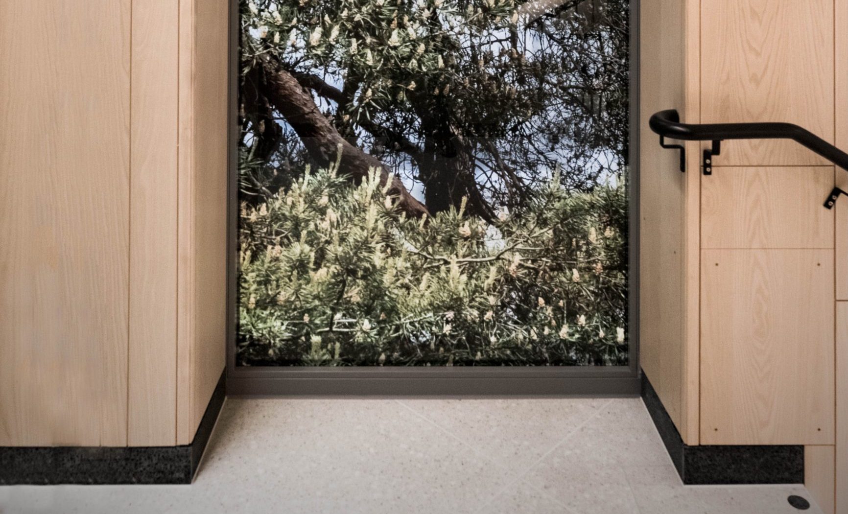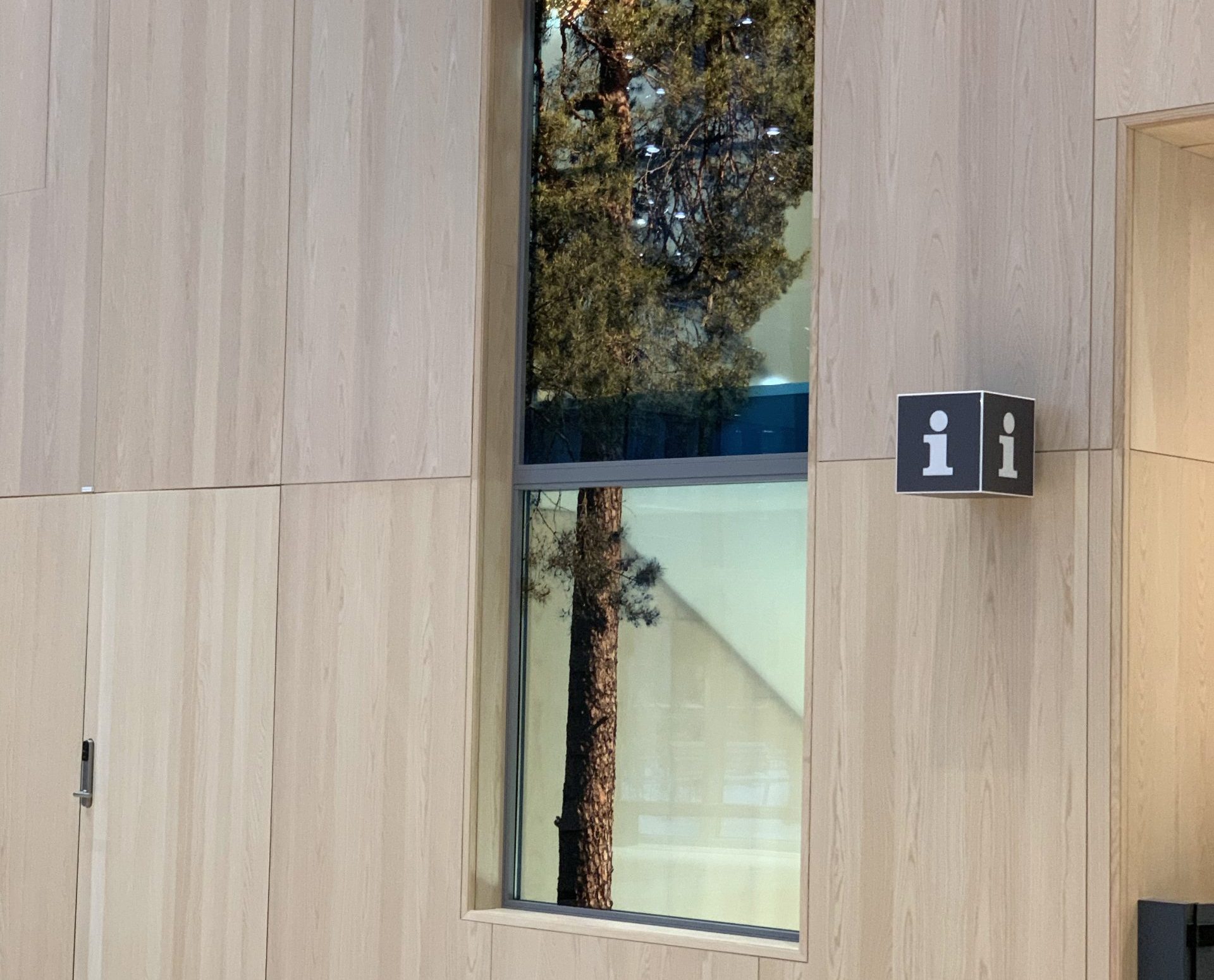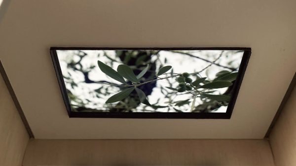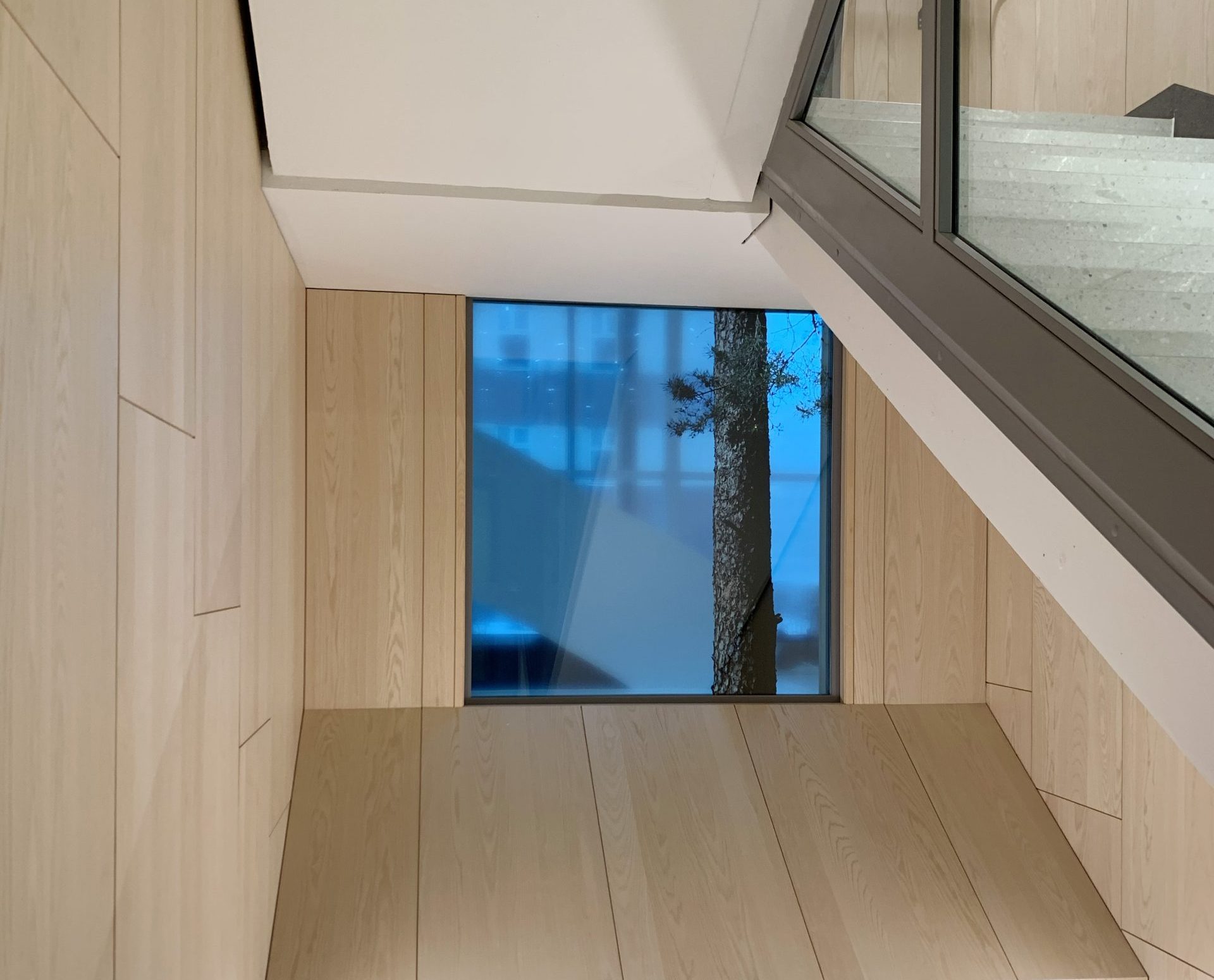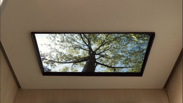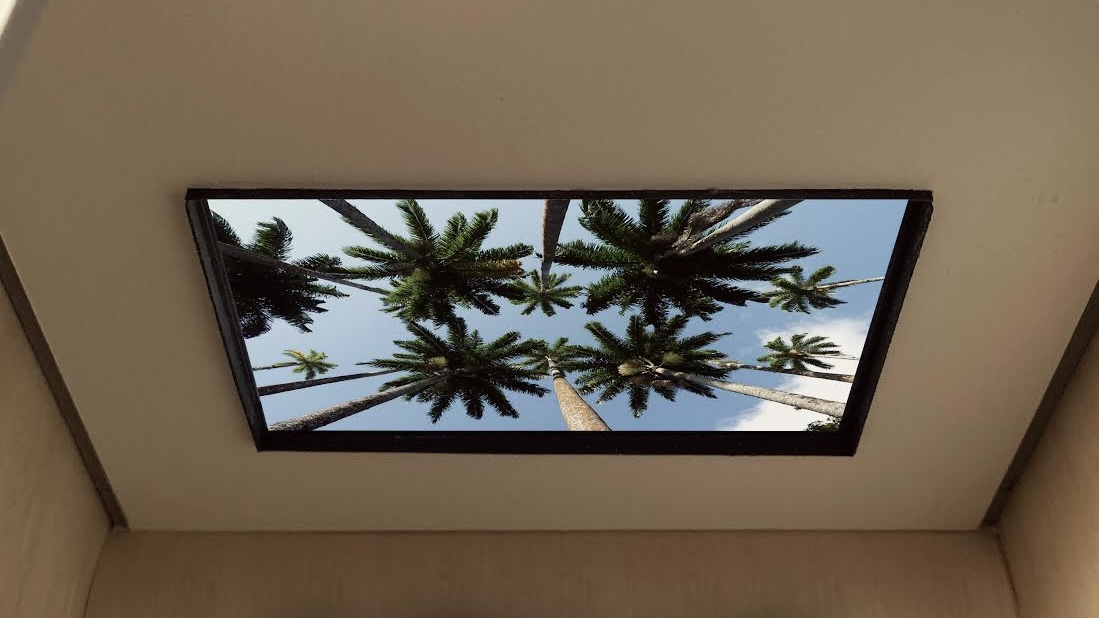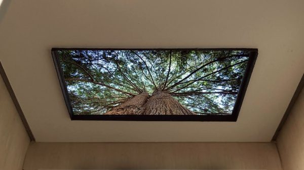Trees to See the Sky Through consists of video installations embedded in elevator ceilings, and two photographic print installations on glass windows in the hospital atrium and the panoramic staircase across 11 floors, all sharing the same theme. Trees are traditionally considered healing or sacred elements across cultures. Each tree in the installations symbolize different places and climate zones. Trees are also used here to reinforce the architectural vision for the building in a structural sense. A single tree printed along the staircase from bottom to top becomes a metaphor that unites the building and the site.