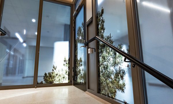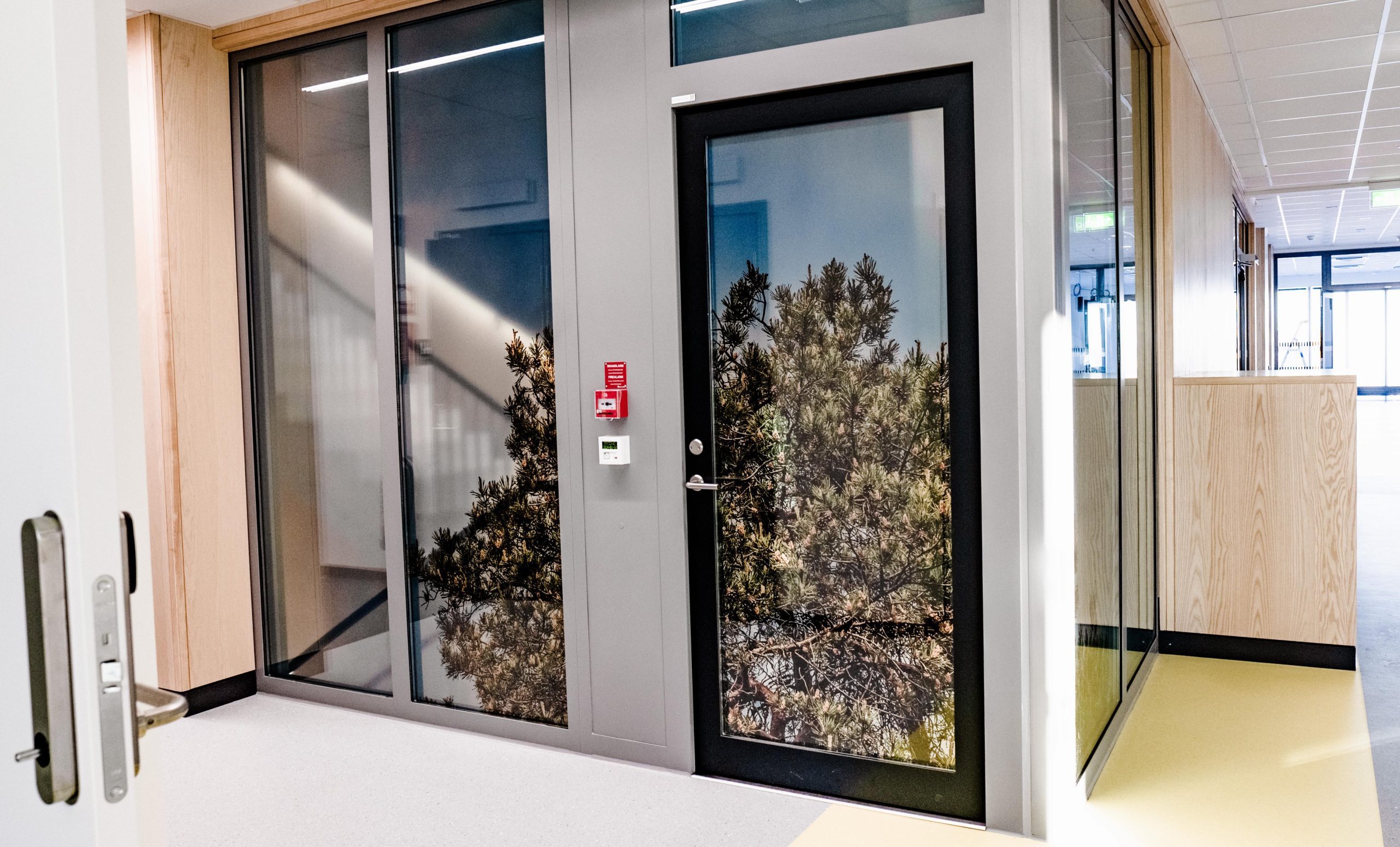 Interior models showing the fragment of a pine tree, printed upon glass surfaces across various locations within the hospital.