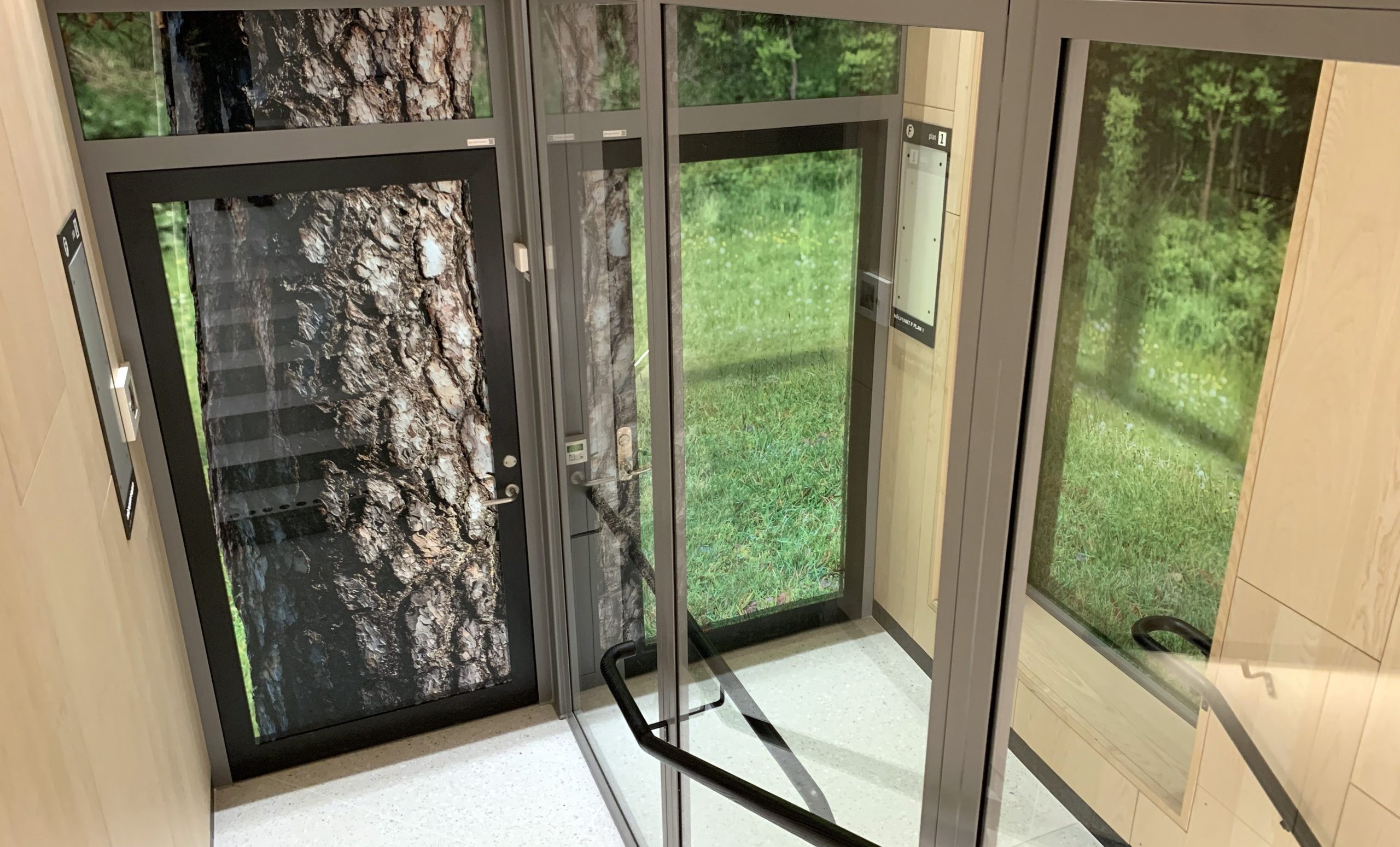 Each of the four elevators show a typical tree from different parts of the world.